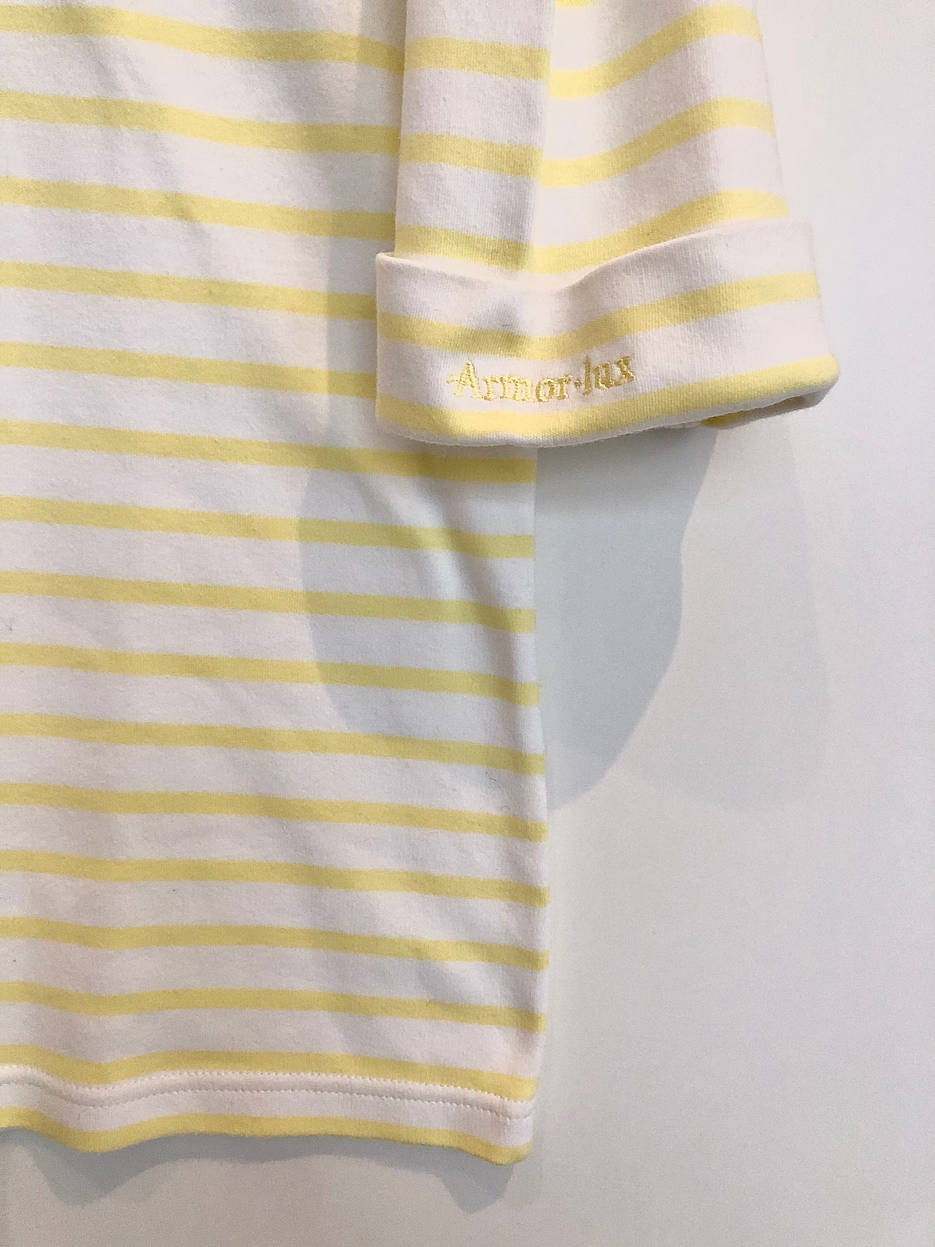 イエローホワイトの爽やかな配色で、半袖の袖先が折り返してます。さらに左袖先には英語でブランド名がイエローステッチで刺繍されてます。