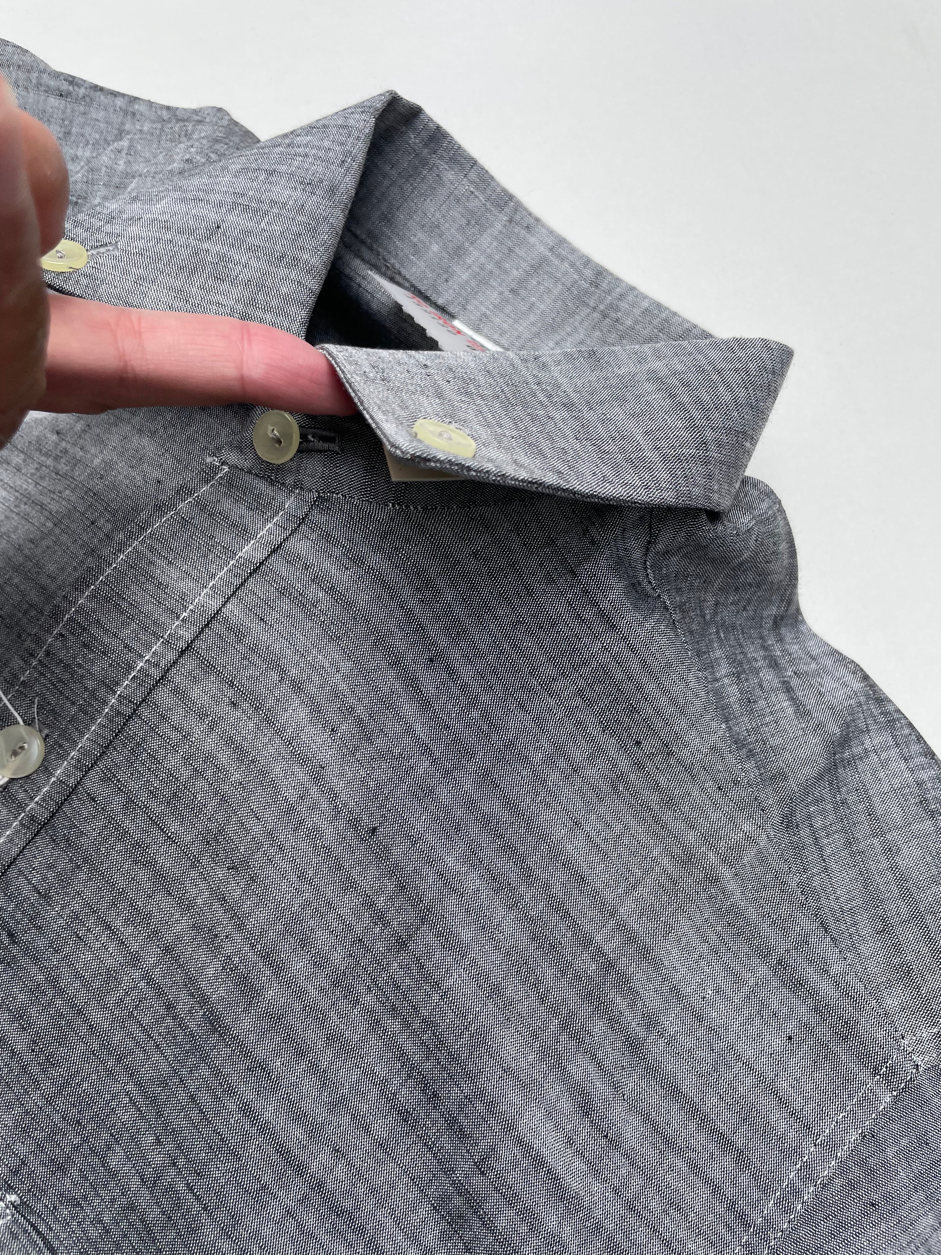 襟先にボタンが付いてあり、一見ボタンダウンシャツに見える不思議なデザイン。