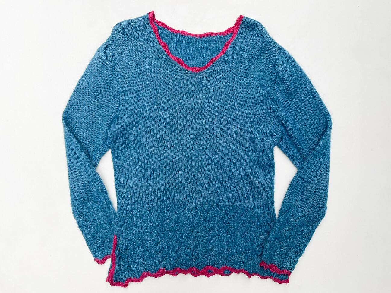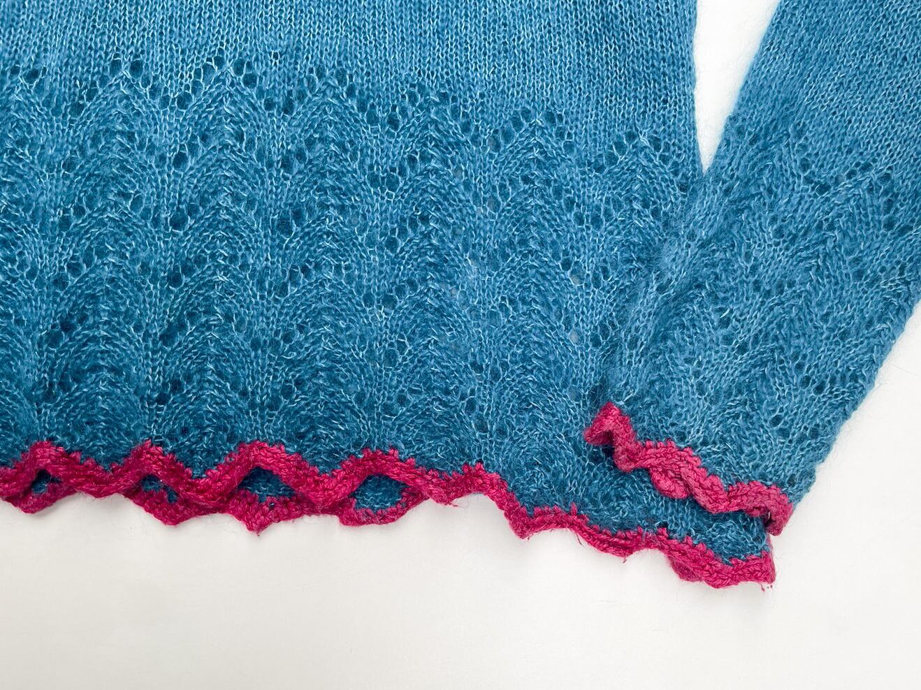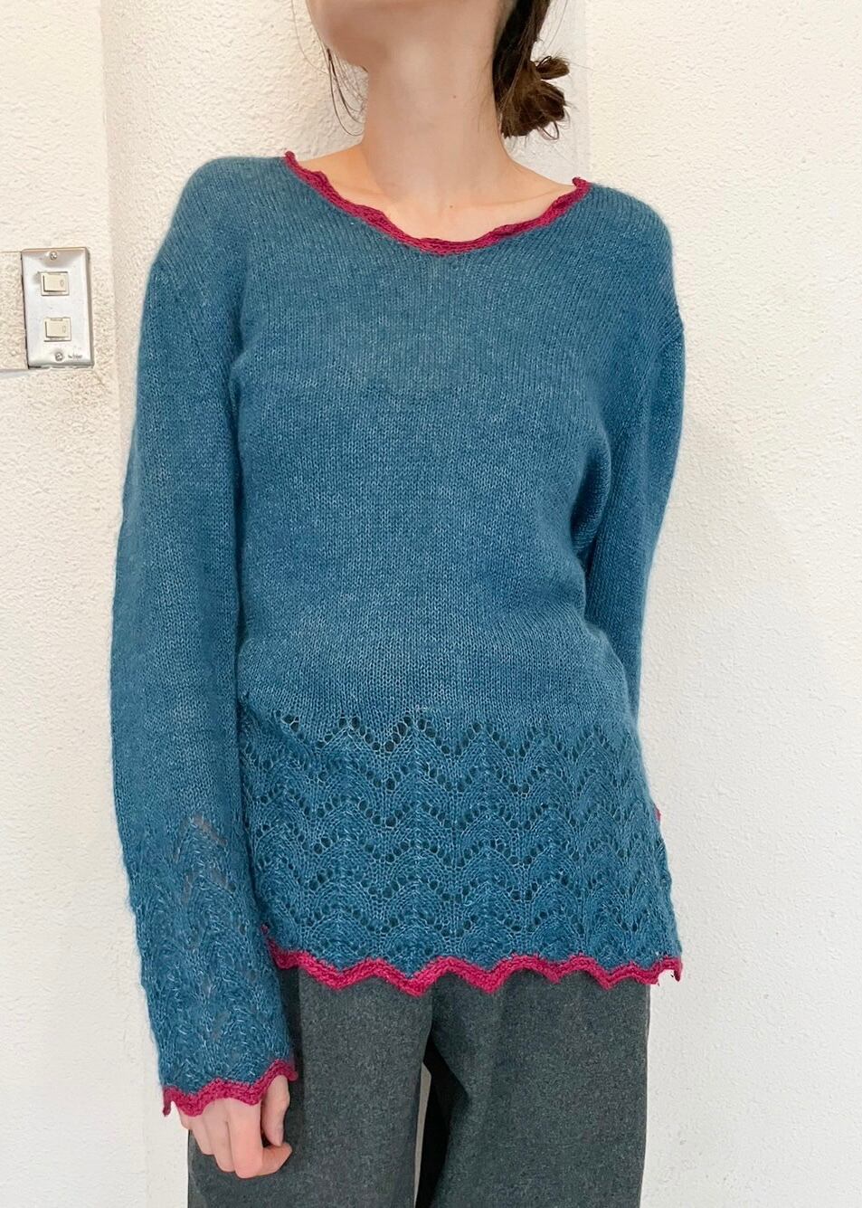 裾と袖先のすかし柄がポイントのニットです。